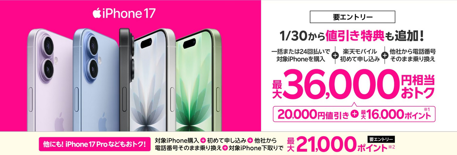 | iPhone 17購入で最大36,000円相当還元キャンペーン! | 最大36,000円お得 |
