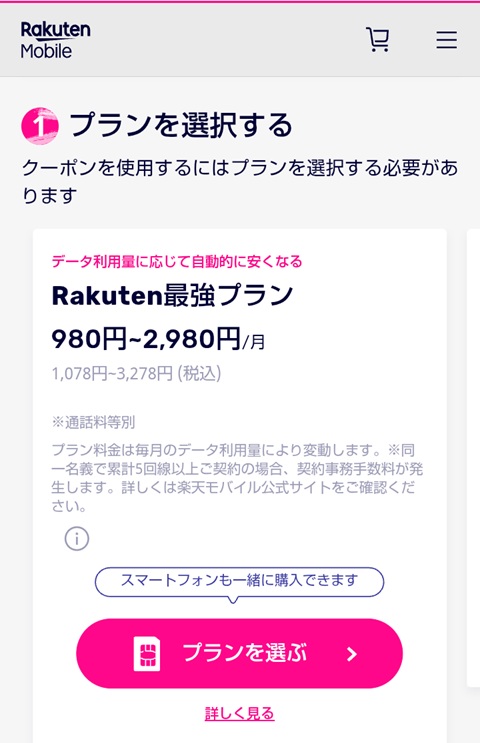 楽天モバイル公式 楽天市場店にて6,000円OFFクーポンを使用された方
