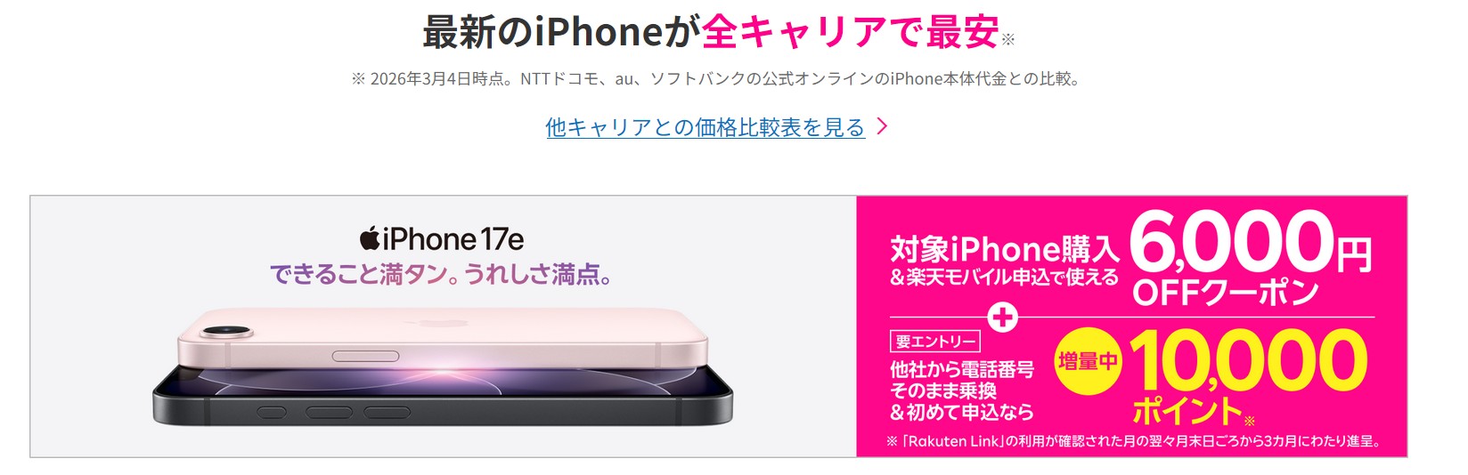 他社から乗り換えでRakuten最強プランご契約とiPhone対象製品を一括払いもしくは24回払いのご購入で割引キャンペーン